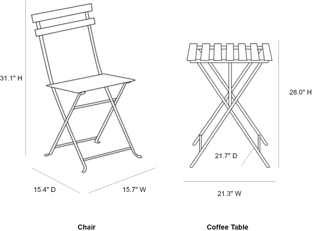 | Chair(in.) | 15.4″ D × 15.7″ W × 31.1″ H | Table(in.) | 21.7″ D × 21.3″ W × 28.0″ H |